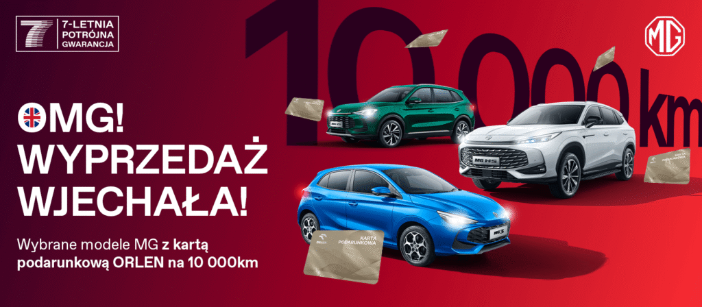 Od dziś rusza nowa kampania: do zakupu auta dodajemy kartę podarunkową ORLEN o równowartości paliwa potrzebnego do przejechania aż 10 000 km. Oferta obowiązuje do 31.12.2025 r, a do udziału w niej kwalifikują się wybrane modele z portfolio MG: MG3, MG ZS oraz MG HS.